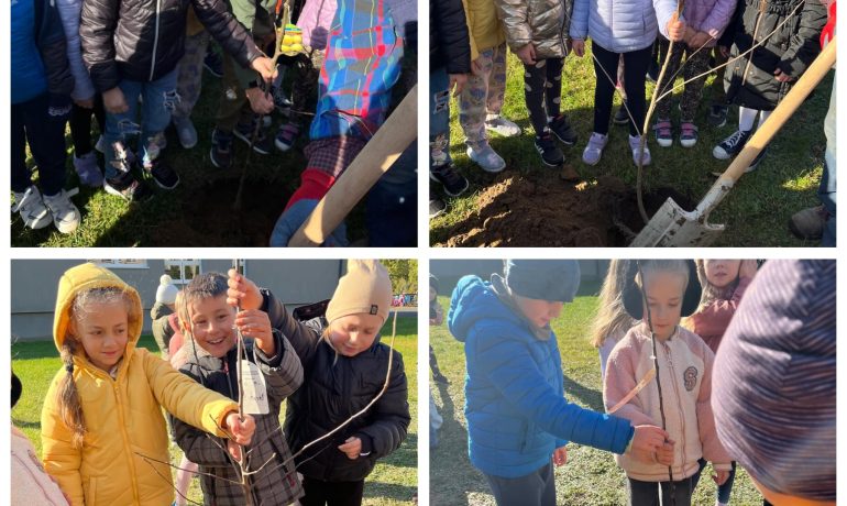 W blasku jesiennego słonka, Pierwszoklasiści zasadzili na szkolnym placu drzewka owocowe: jabłonie, śliwy, wiśnie i czereśnie. Drzewka zostały zakupione ze środków zebranych w kawiarence Marchew...