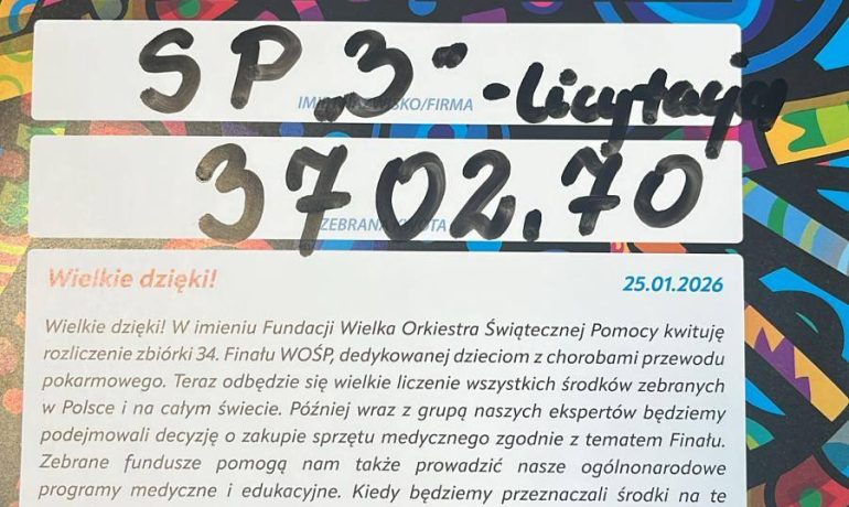 Wielkie brawa dla naszych wspaniałych uczniów! Podczas szkolnej licytacji WOŚP, prowadzonej przez Samorząd Uczniowski, zebraliśmy aż 3702,70 zł. Dziękujemy wszystkim za zaangażowanie i ogromne serca...