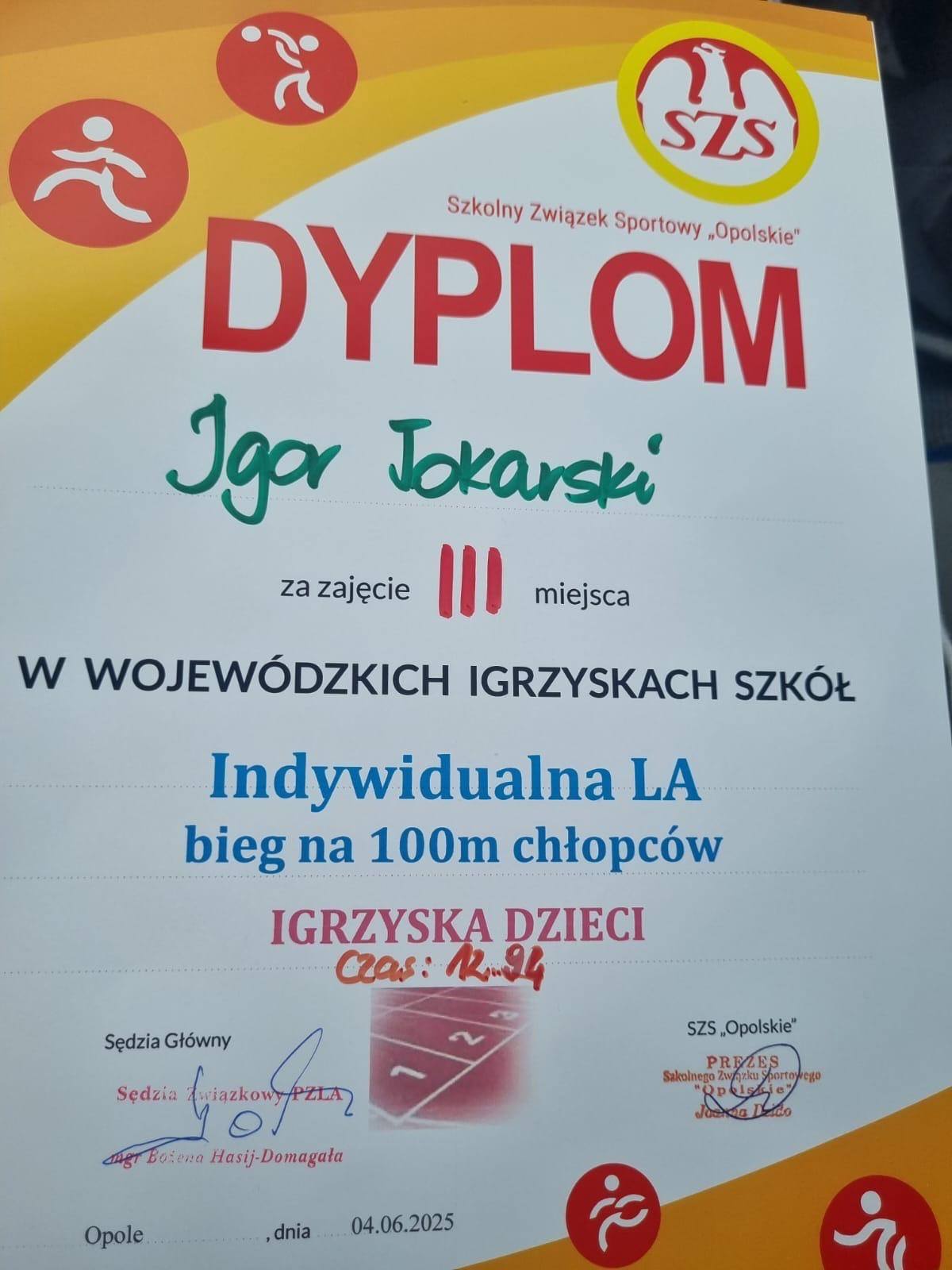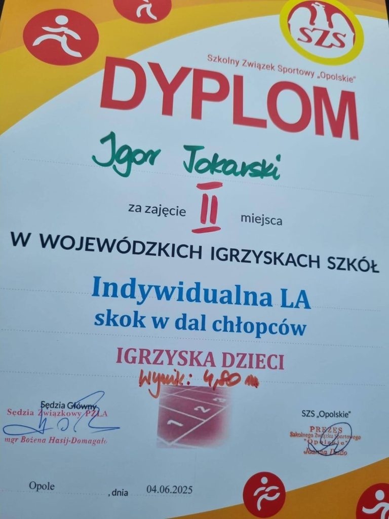 4 czerwca, 2025in Bez kategoriiby admin Brawo, Igor! 03.06.2025r. w finale wojewódzkim Lekkiej Atletyki Igrzyska Dzieci Igor Tokarski zdobył srebrny medal w skoku w dal i brąz w biegu na 100 metrów. Gratulujemy!