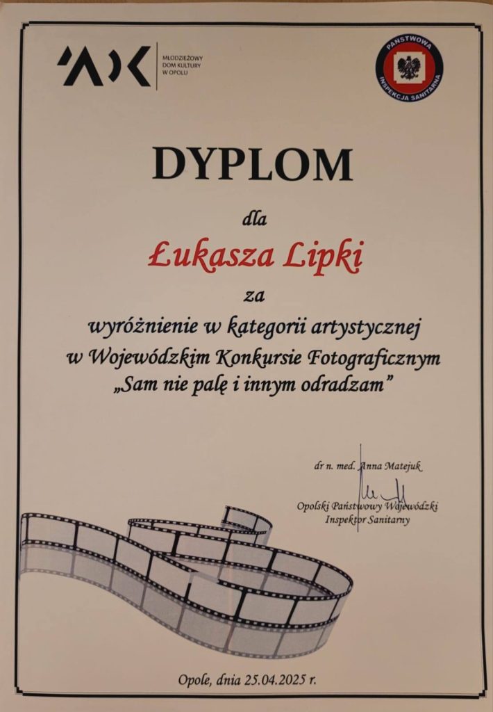 20 maja, 2025in Bez kategoriiby admin Brawo Łukasz! Łukasz Lipka kl.VIII a uzyskał wyróżnienie w kategorii artystycznej w Wojewódzkim Konkursie Fotograficznym „Sam nie palę i innym odradzam”. Gratulacje! Prezentujemy prace konkursowe uczestników z naszej szkoły.