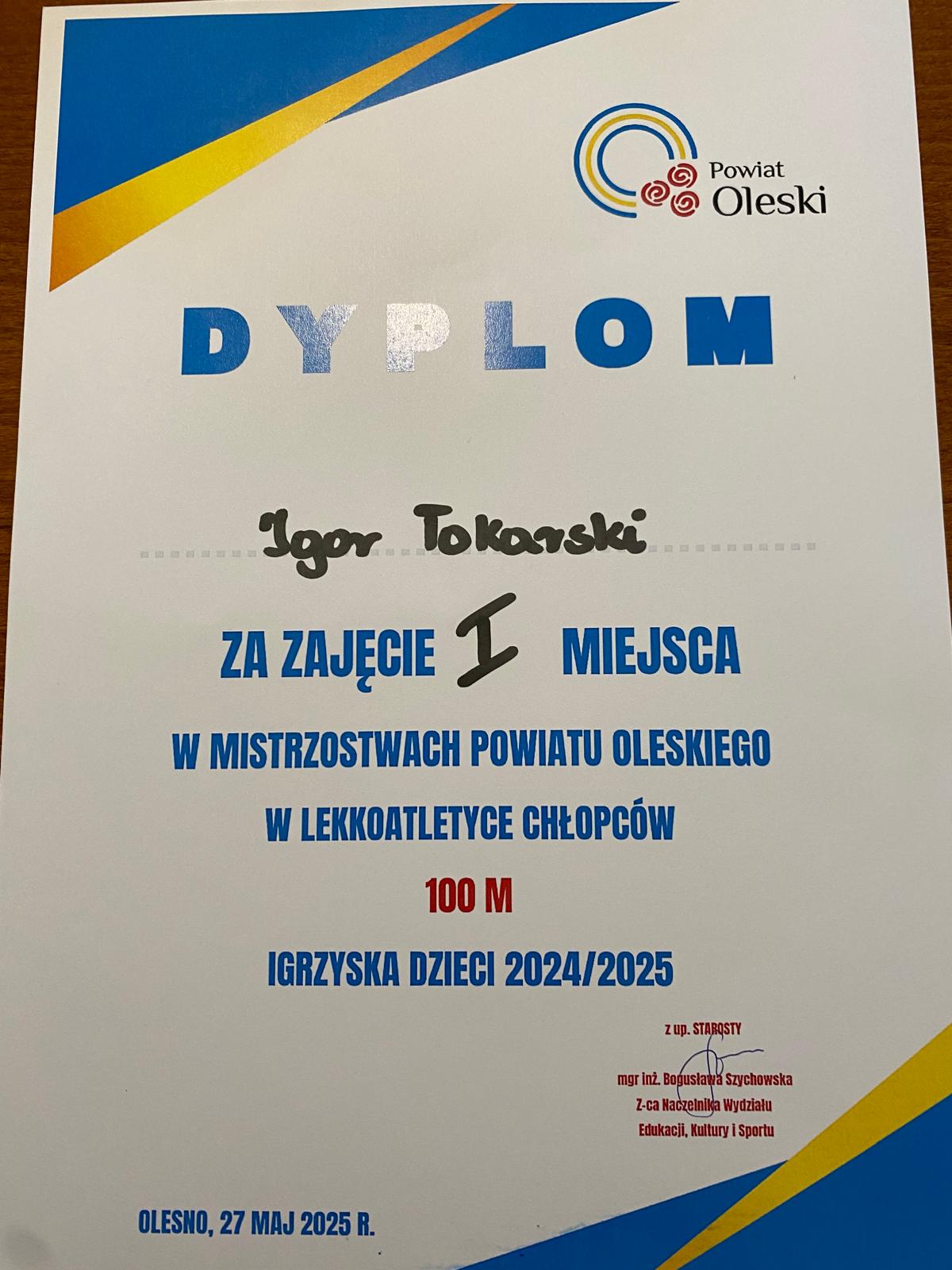 🏆Igor Tokarski indywidualnie – podwójne 1 miejsce w biegu na 100 m i skoku w dal.