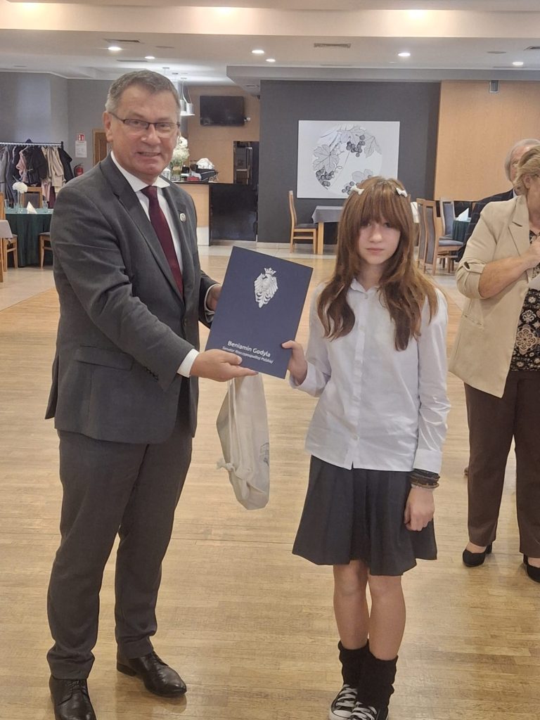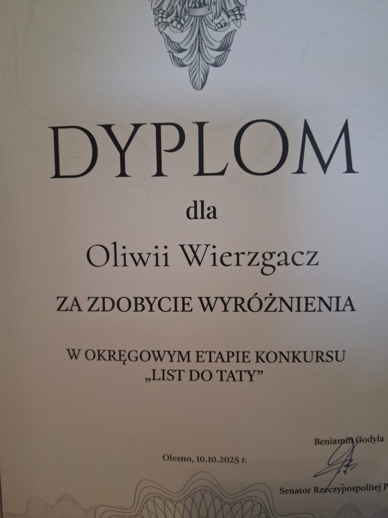 Dnia 10 X 2025 w Pałacu w Pawłowicach odbyło się podsumowanie konkursu „List do Taty”, organizowanego przez Senatora RP Pana Beniamina Godylę. Jury oceniło 170 nadesłanych prac konkursowych, wśród których wyróżniło list Oliwii Wierzgacz z klasy 6b. Wszystkim nagrodzonym gratulujemy.