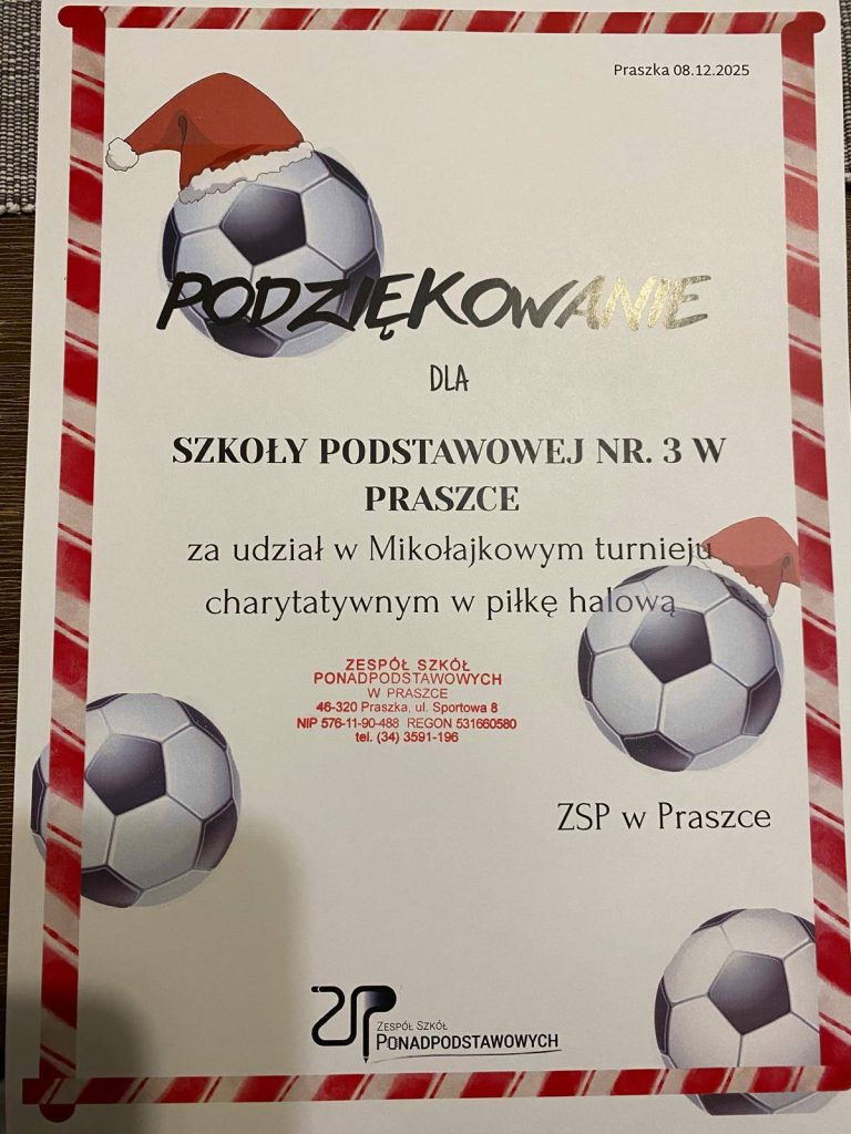 11 grudnia, 2025in Bez kategoriiby admin Mikołajkowy turniej charytatywny Uczniowie naszej szkoły wzięli udział w Mikołajkowym turnieju charytatywnym w piłkę halową organizowanym przez ZSP w Praszce