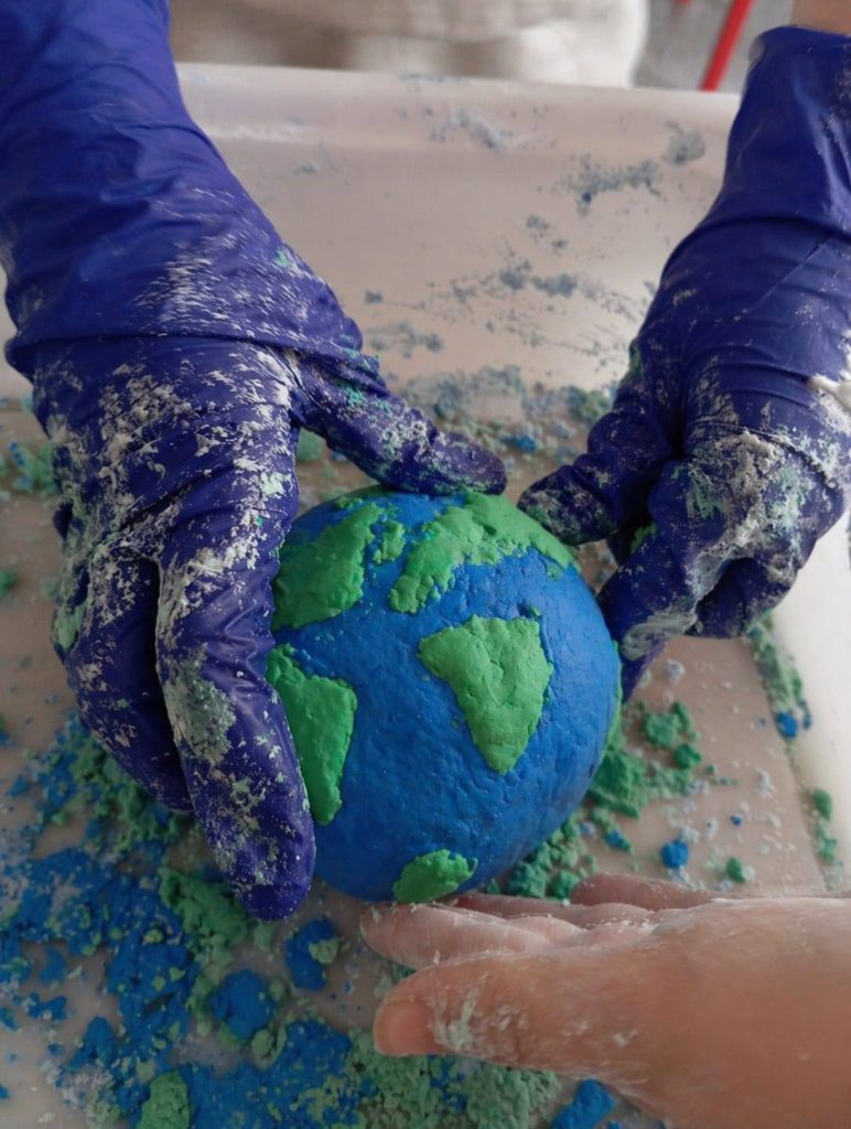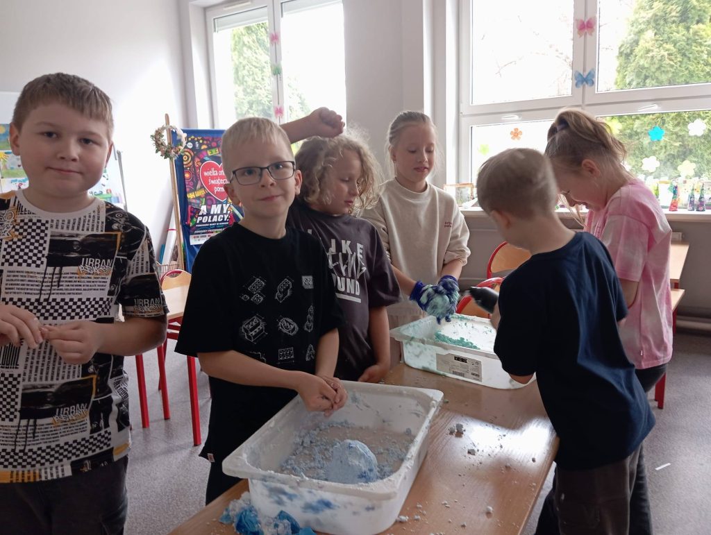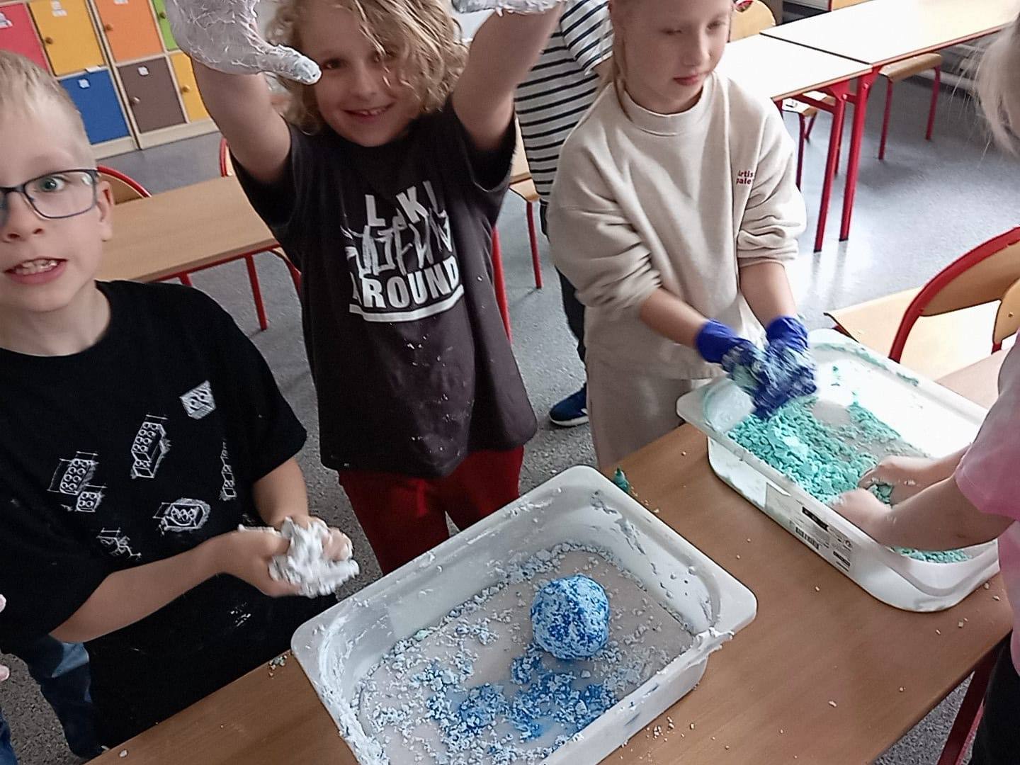 Świetliczaki z ogromnym zaangażowaniem, z okazji zbliżającego się Dnia Ziemi, wykonywały eksperyment chemiczny- kulę ziemską 3D