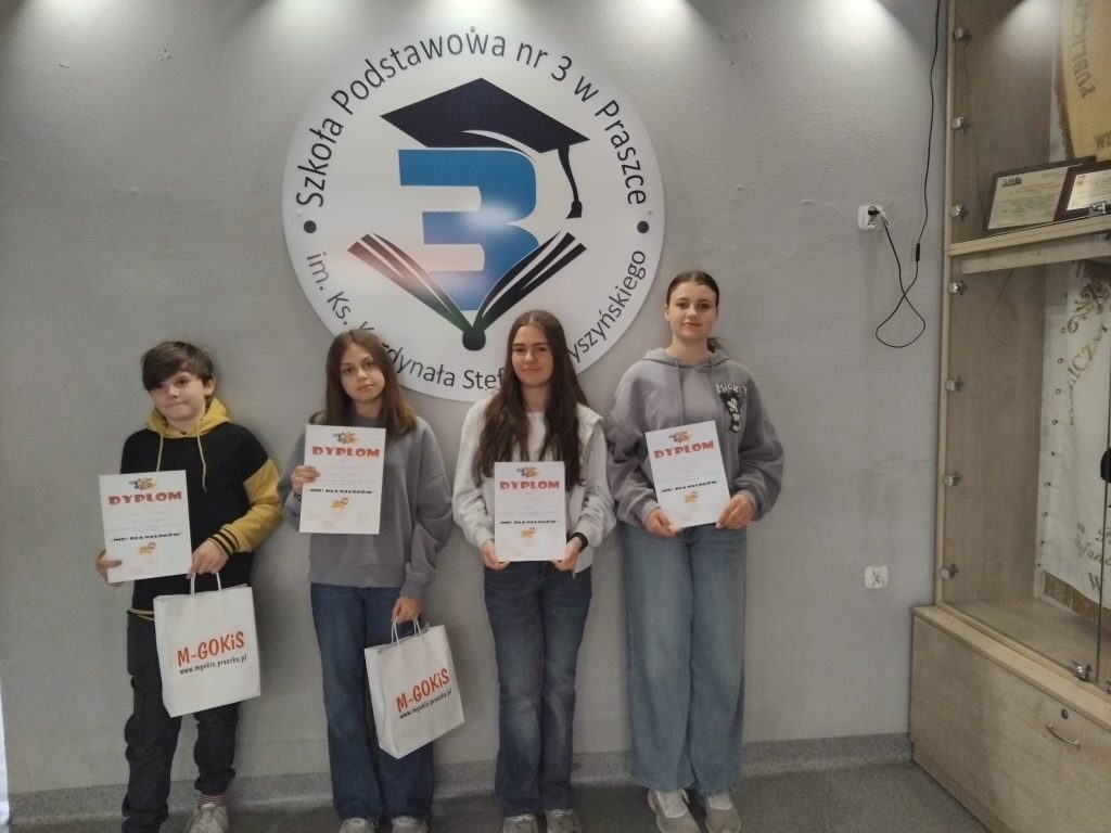 W kategorii klas 4-6 II miejsce zajęła Aleksandra Słowik (5a), III miejsce zajął Franciszek Mistygacz (5b). Naszą szkołę reprezentowali również uczniowie w kategorii klas 1-3: Oskar Sikora (3a) i Leon Rakowski (3b) oraz uczennice w kategorii klas 7-8: Lena Klimek (8a) i Maria Stasiak (8b). W dniu 3 kwietnia w Domu Kultury uczestnicy konkursu samodzielnie tworzyli swoje prace z zastosowaniem różnych technik plastycznych. Dziękujemy wszystkim za udział w konkursie i gratulujemy nagrodzonym.