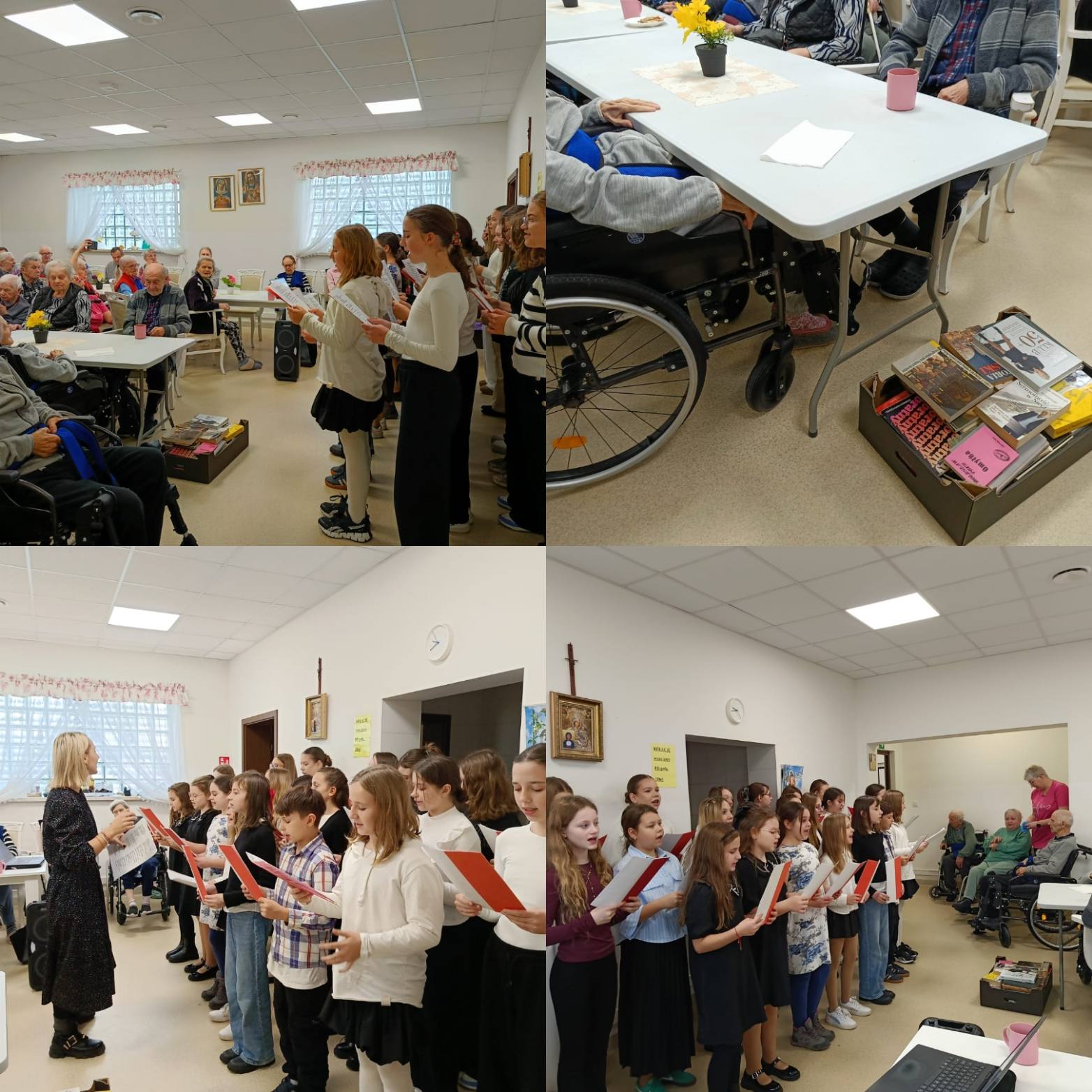 Podczas wizyty uczniowie przekazali także zebrane w szkole książki do czytania, które dzięki ich zaangażowaniu trafiły do rąk mieszkańców i podopiecznych. Była to nie tylko okazja do wspólnego śpiewania i rozmów, ale również do dzielenia się kulturą, wartościami oraz radością płynącą z czytania.