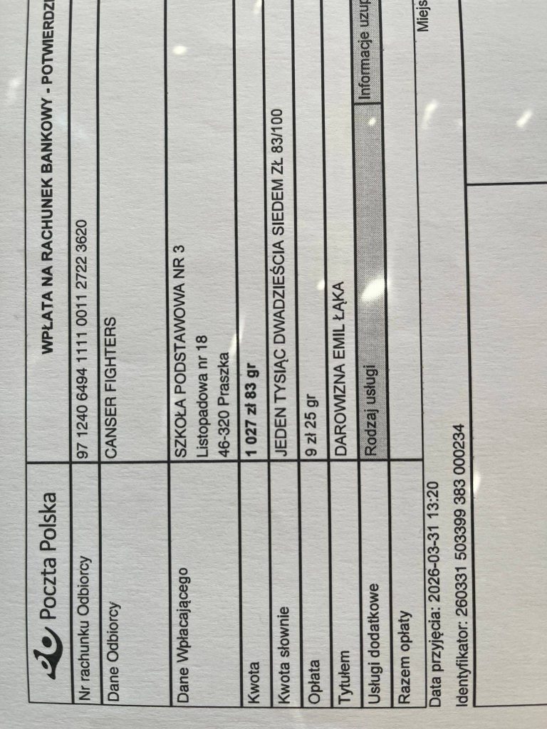 1 kwietnia, 2026in Bez kategoriiby admin Pomagamy! Pomagamy Samorząd Uczniowski zorganizował akcję świątecznego pomagania dla brata naszego ucznia, który zmaga się z chorobą nowotworową. Nie zabrakło atrakcji – były soki, popcorn, wata cukrowa oraz loteria Dzięki ogromnemu zaangażowaniu udało nam się wspólnie zebrać 1027,83 zł Dziękujemy wszystkim za okazane serce i wsparcie! Razem możemy więcej