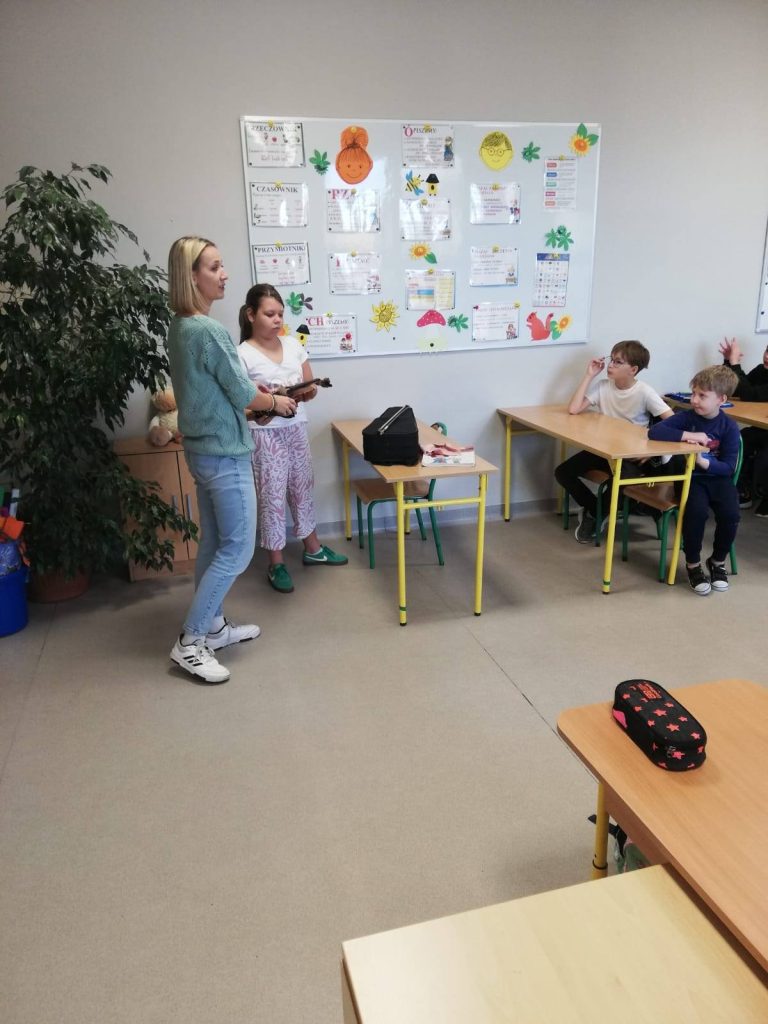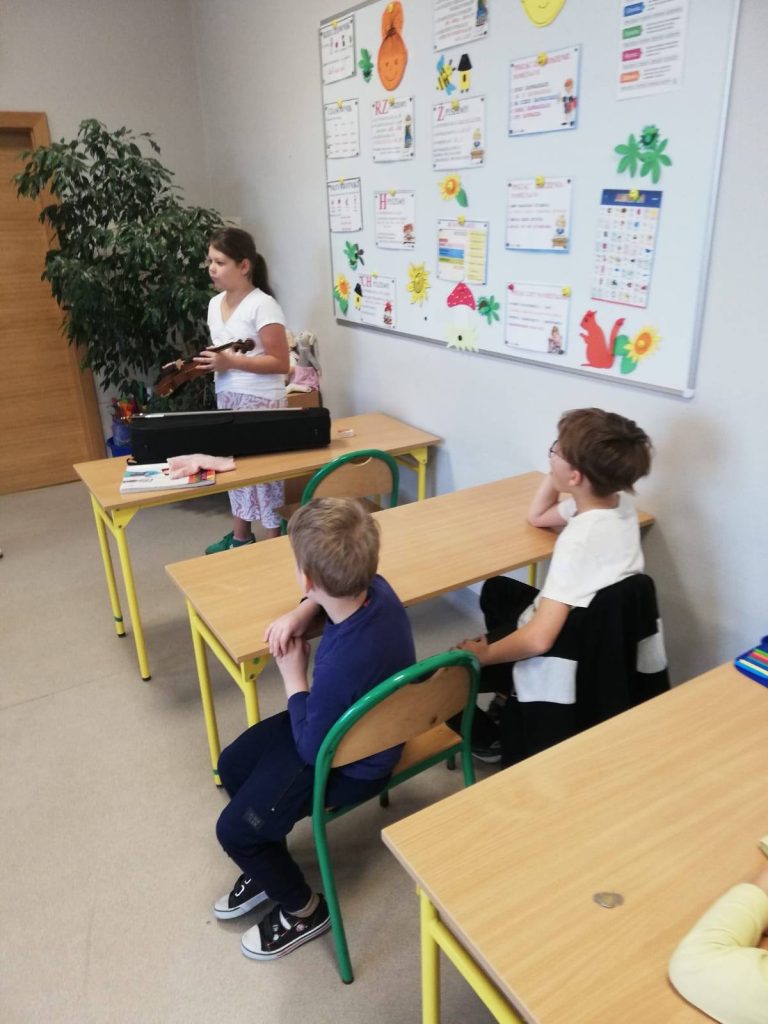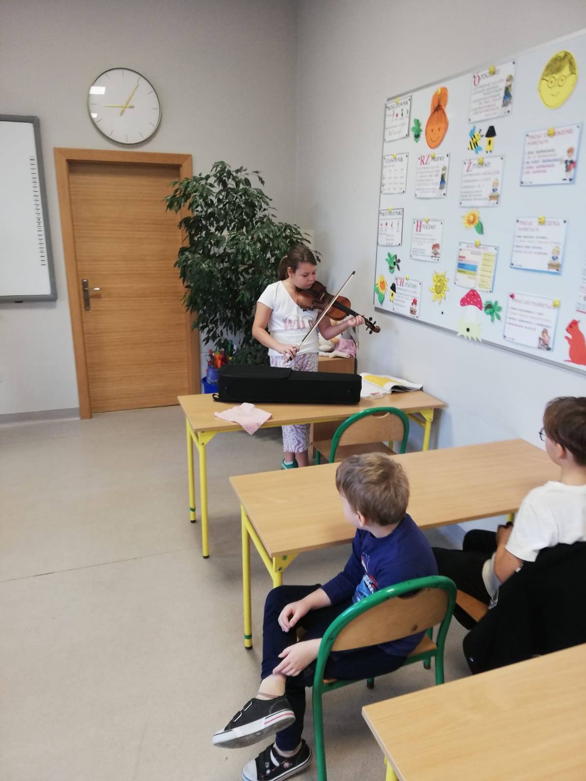 Gościem w naszej klasie była uczennica Lena Kiński, która nie tylko przybliżyła młodszym koleżankom i kolegom budowę skrzypiec, ale również zaprezentowała swoje umiejętności muzyczne na tym instrumencie. Trzecioklasiści z wielkim zainteresowaniem wysłuchali prezentacji starszej koleżanki.