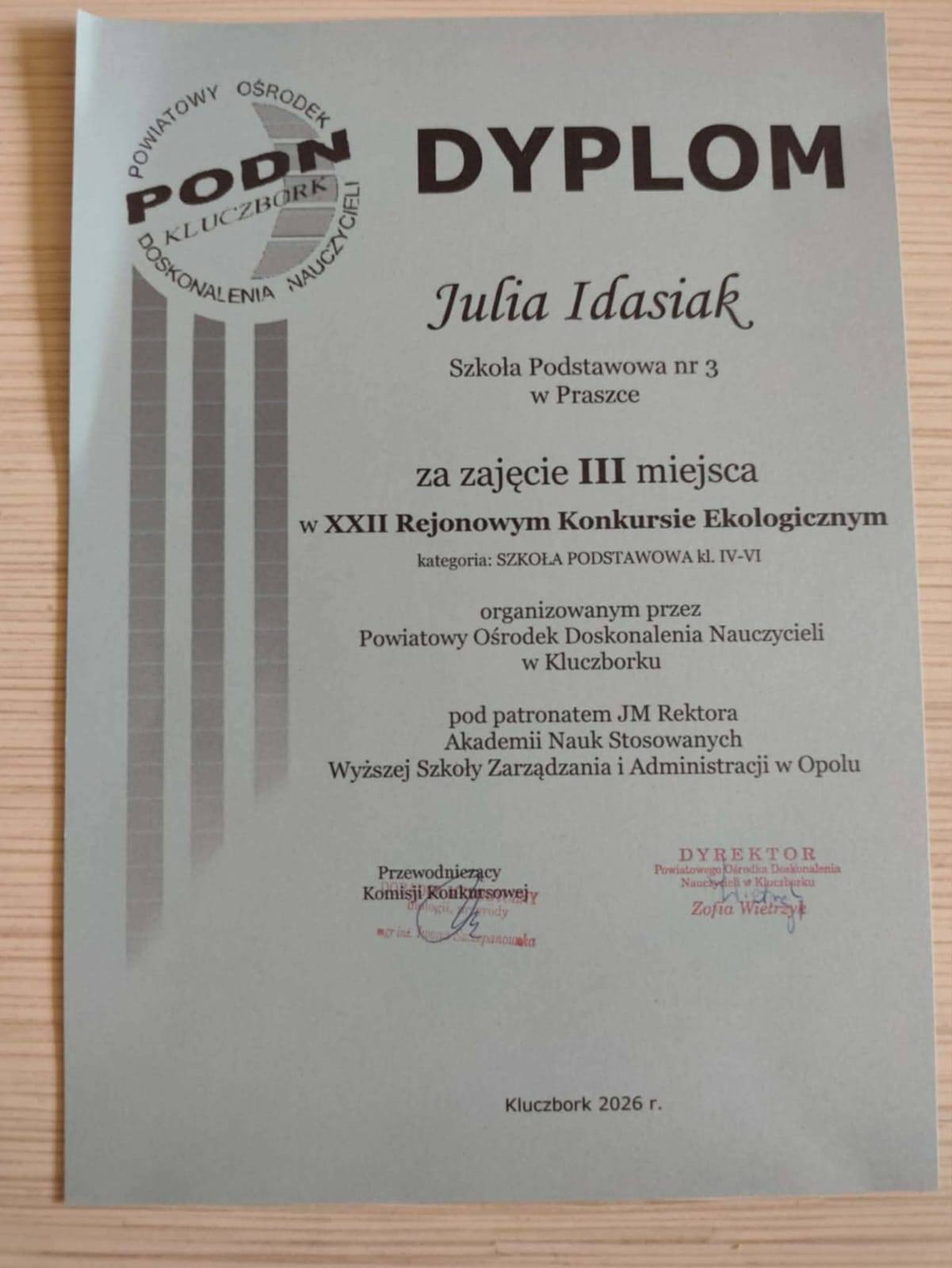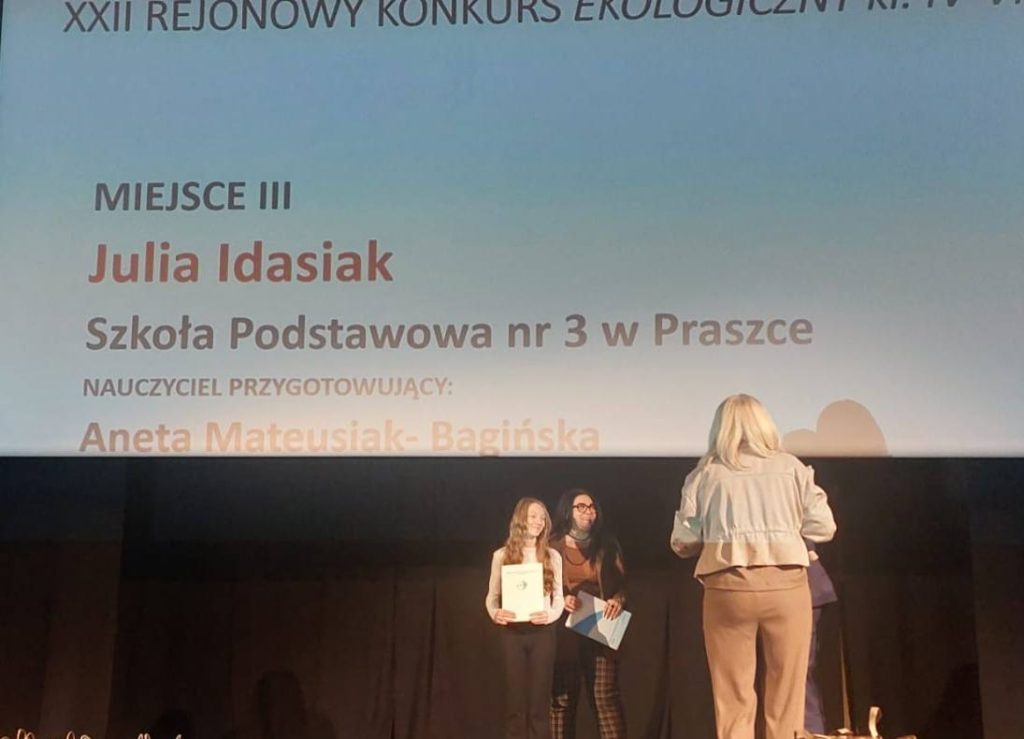 Julia Idasiak (kl. VI b) – za zajęcie III miejsca w XXII Rejonowym Konkursie Ekologicznym (kl. IV–VI)