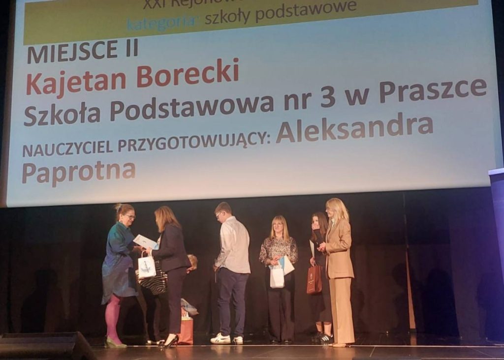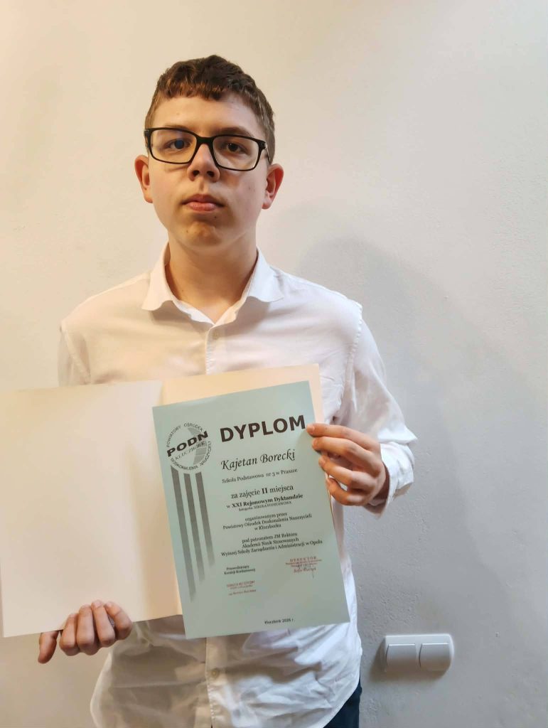 Kajetan Borecki (kl. VII b) – za zajęcie II miejsca w XXI Rejonowym Dyktandzie (kategoria: szkoła podstawowa)