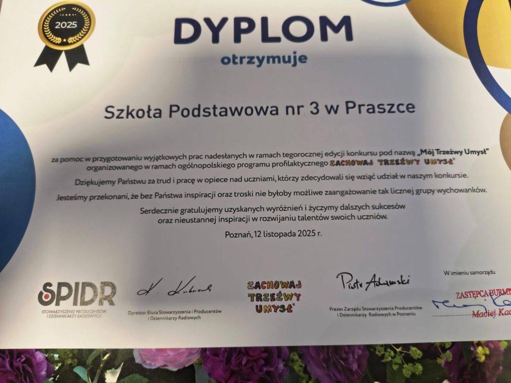 11 grudnia, 2025in Bez kategoriiby admin ,,Zachowaj Trzeźwy Umysł” W tegorocznej edycji programu profilaktycznego ,,Zachowaj Trzeźwy Umysł” doceniono prace naszych uczennic. Laureatką nagrody głównej została Lena Kiński, wyróżniono również prace Wiktorii Raj i Amelii Simbor. Brawo